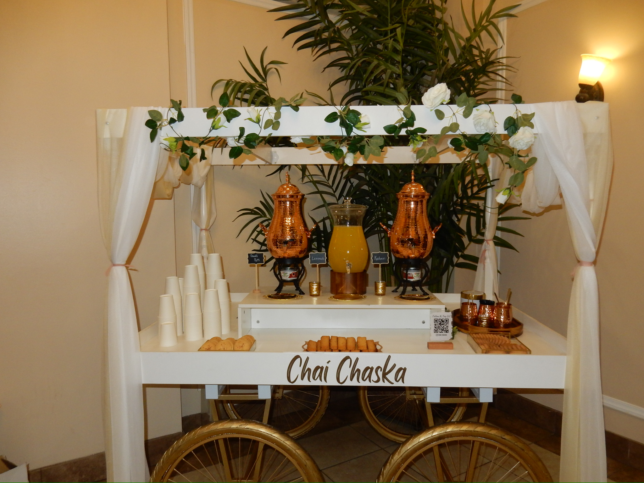Our Chai Chaska Cart come beautifully decorated to match your color theme! We provide assorted biscuits along with decor, sugar, stirrers, cups & etc.
